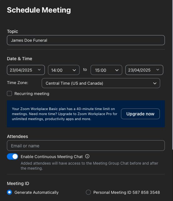 Create a Zoom account if you don't already have one. For funeral services, consider upgrading to a paid plan, as the free version has significant limitations: